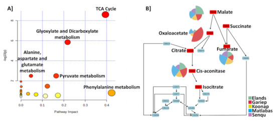 Chemometrically extracted metabolites in Table S2 were used to perform metabolic pathway analysis using MetaboAnalyst Pathway Analysis (MetPA) to reveal impactful metabolic pathways associated with the generated data across all five cultivars (Figure 5A). The phenylalanine (Phe), TCA cycle, glyoxylate and dicarboxylate metabolism, and pyruvate metabolism pathways showed relatively high impact based on matched metabolites from the data. The most statistically significant pathways were the TCA cycle, glyoxylate and dicarboxylate metabolism, pyruvate metabolism and the alanine, and aspartate and glutamate metabolism pathways listed above from the most significant and the most impactful pathways.