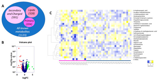 Identification of 17 metabolites differentially expressed between urine of dogs with UC vs. control. (A) Nested Venn Diagram depicting the different types of metabolites identified as differentially expressed between the urine of dogs with urothelial carcinoma and control dogs. (B) Volcano plot depicting differentially expressed metabolites between UC and control groups. Red stars represent significantly downregulated metabolites (logFC ≤ −1.5 and adjusted p-value < 0.05) whereas green stars represent significantly upregulated metabolites (logFC ≥ 1.5 and adjusted p-value < 0.05). (C) Heatmap showing 17 differentially expressed metabolites in UC (right) vs. control (left) groups. These represent the final 17 metabolites after those related to treatment were removed. Complete Linkage was used as the clustering method with Spearman Rank correlation as a distance measurement method.