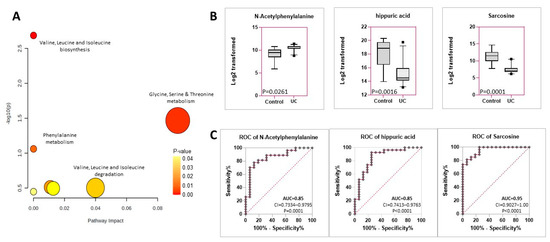 We next investigated whether components of the phenylalanine metabolism pathway can distinguish between the UC and control groups. The area under the Receiver Operating Characteristics (ROC) curve (AUC) for hippuric acid and NAMH both showed specificity and sensitivity with AUC = 0.85 for both (p = 0.0001 or <0.0001, respectively) (Figure 2C). In contrast, members of the valine, leucine, and isoleucine biosynthesis pathway (L-Threonine, 3-Methyl-2-Oxovaleric acid, 2-hydroxy-4-methylpentanoic acid), although individually differentially expressed between the two groups, did not show a significant ability to distinguish between UC and control (AUC < 0.75) (Figure S2). However, sarcosine, which mapped to the Glycine, Serine and Threonine Metabolism pathway, was also a significant distinguishing factor (AUC = 0.95, p < 0.0001) (Figure 2C) (threonine (Figure S2) is also a component of this pathway). Taken together, alterations of the phenylalanine pathway and the glycine, serine and threonine metabolism pathway were distinctive in UC vs. controls.