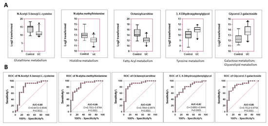 Three additional metabolites, not in the above pathways, were also differentially expressed, and could distinguish between UC and control. (A) Box plots showing the differential expression of additional metabolites significantly different between UC and controls of which three are downregulated (N-Acetyl-S-benzyl-L-cysteine, N-alpha-methylhistamine, and Octanoylcarnitine) and two are upregulated (3,4-Dihydroxyphenylglycol and glycerol-3-galactoside). Related pathways are listed below the plot. (B) ROC curves for the above metabolites. Area under the ROC curve (AUC) is calculated as sensitivity percentage vs. 100-specificity percentage. AUC > 0.85 is considered to be highly discriminatory. Thus, only three of the five metabolites were considered highly discriminatory (Octanoylcarnitine, N-alpha-methylhistamine, and glycerol-3-galactoside).