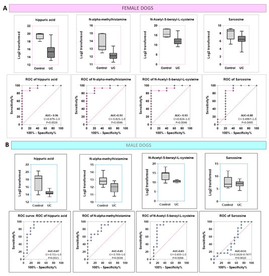 Comparison of the expression of specific metabolites in male and female dogs with UC vs. controls. (A) Box plots showing the differential expression of four metabolites significantly different between UC vs. control (hippuric acid, N-Acetyl-S-benzyl-L-cysteine, N-alpha-methylhistamine, and sarcosine) in female dogs. The lower level shows ROC curves for the above metabolites. Only three of the four metabolites were considered highly discriminatory (hippuric acid, N-Acetyl-S-benzyl-L-cysteine, N-alpha-methylhistamine) (AUC > 0.85). (B) Box plots showing the differential expression of four metabolites significantly different between UC vs. control in male dogs. The lower level shows ROC curves for the above metabolites. Only two of the four metabolites were considered highly discriminatory (hippuric acid, N-alpha-methylhistamine) (AUC > 0.85).