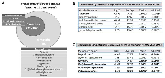 Breed specific differences between UC vs. control. (A) Venn diagram demonstrating differentially expressed metabolites in terrier breeds vs. all other breeds among dogs with UC only and comparing it with differentially expressed metabolites in terriers and all other breeds among control dogs. Differentially expressed metabolites in each group are outlined in the inset accompanying each group. (B) Differential expression between UC vs. control of the six metabolites in terrier breeds only. Note that, of the six metabolites deemed highly discriminatory in Figure 2 and Figure 3 (highlighted in bold), only sarcosine was differentially expressed in terrier breeds. (C) Differential expression between UC and controls of the six metabolites in retriever breeds only. Note that, of the six metabolites deemed highly discriminatory in Figure 2 and Figure 3, five were differentially expressed in retriever breeds. Glycerol-3-galactoside was not differentially expressed in either terrier breeds or in retriever breed groupings.
