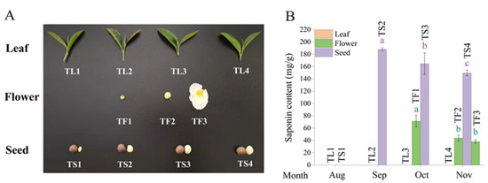 Changes of saponin content in different tissues of the tea plant. (A) The tea leaves, flowers and seeds were collected from September to November. (B) The saponin content in different samples. Data represent means ± SD from three biological replicates. Different letters indicate significant differences (p < 0.05).