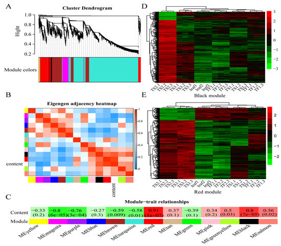 Weighted gene coexpression network analysis (WGCNA) and modules related to saponin biosynthesis. (A) Cluster dendrogram showing 13 coexpressed gene modules identified via WGCNA. Each module is labeled with a different color. (B) Eigengene adjacency heatmap showing the relationship between the modules with each other and saponin content. (C) Pearson correlation coefficient (R) and the p value for saponin content and each module. (D) Cluster heat map of the differentially expressed genes (DEGs) from the MEblack module. (E) Cluster heat map of DEGs from the MEred module. The color in the heat map represents the corresponding FPKM value of genes.