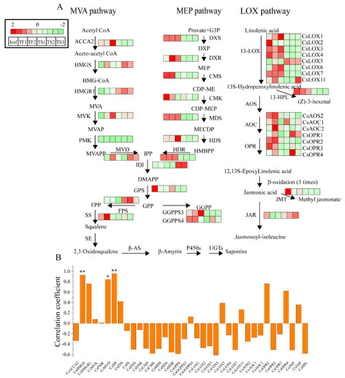 Expression pattern of genes putatively involved the biosynthesis of triterpene saponins in tea leaves, flowers and seeds. (A) Expression of genes in MVA, MEP and LOX pathways. (B) Correlation analysis between saponin content and biosynthesis-related genes. * p < 0.05, ** p < 0.01. MVA, mevalonate; MEP, 2-methyl-d-erythritol-4-phosphate; LOX, lipoxygenase; ACCT, 3-ketoacyl-CoA thiolase; HMGS, 3-hydroxy-3-methylglutaryl-CoA synthase; HMGR1, 3-hydroxy-3-methylglutaryl coenzyme A reductase; MVK, mevalonate kinase; PMK, phosphomevalonate kinase; MVD, diphosphomevalonate decarboxylase; IDI, isopentenyl diphosphate isomerase; FPS, farnesyl diphosphate; SS, squalene synthase; DXS, 1-deoxy-d-xylulose-5-phosphate synthase; DXR, 1-deoxy-d-xylulose 5-phosphate reductoisomerase; CMS, 2-C-methyl-d-erythritol 4-phosphate cytidylyltransferase; CMK, 4-diphosphocytidyl-2-C-methyl-d-erythritol kinase; MDS, 2-C-methyl-d-erythritol 2,4-cyclodiphosphate synthase; HDS, hydroxymethylbutenyl diphosphate synthase; HDR, hydroxymethylbutenyl diphosphate reductase; GPPS, geranyl pyrophosphate synthase; GGPPS3, geranylgeranyl pyrophosphate synthase 3; GGPPS4, geranylgeranyl pyrophosphate synthase 4; 13-LOX, 13-lipoxygenase; AOS, allene oxide synthase; AOC, allene oxide cyclase; OPR, 12-oxo-phytodienoic acid reductase; JMT, jasmonic acid carboxyl methyltransferase; JAR, jasmonic acid amido synthetase; 13-HPL, 13-hydroperoxide lyase.