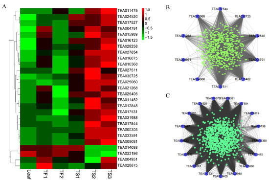 A total of 27 transcription factors (TF) were found in the red and black modules, and their expression patterns are presented in Figure 5A. Most of these TFs were highly expressed in the mature seeds (TS2 and TS3), and lowly expressed in leaves. Cytoscape was used to represent the interaction network diagram of these TFs with other genes in each module (Figure 5B,C). Table 1 showed that these TFs belonged to nine TF families, including AP2, bHLH, bZIP, GARP, GATA, MYB, TCP, Trihelix and WRKY. Among them, the expressions of eight TFs (TEA004791, TEA012848, TEA017531, TEA016075, TEA011482, TEA015989, TEA027854 and TEA009081) were positively correlated with the saponin content in both the seeds and flowers, and two TFs (TEA014088, TEA033198) were negatively related (p < 0.05 or p < 0.01). Some of the other TFs were only associated with the saponin content in either flowers or seeds (p < 0.05 or p < 0.01). The interaction network diagram analyzed with Cytoscape showed that the above-mentioned TFs were highly coexpressed with HMGS, HGMR1, CsIDI, CsMVD or CsOPR4, which further illustrated that they were very relevant to tea saponin synthesis.