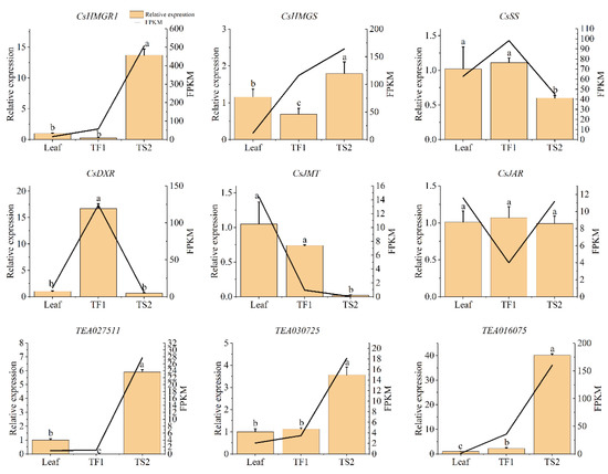 Relative expression of nine selected genes involved in saponin metabolism to EF-1α. Data represent means ± SD from three biological replicates. Different letters indicate a significant difference (p < 0.05). The column represents the gene mRNA level determined with qRT-PCR. The line represents the FPKM value of the gene.