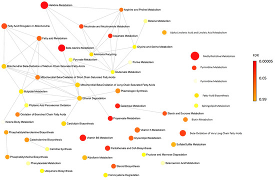 Network analysis for the plasma metabolites. Active pathways adjusted for FDR (<0.05) in participants received animal protein diet, compared to those in soybean protein.
