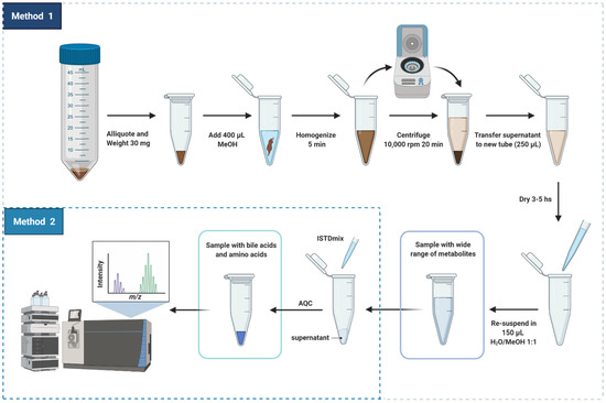 In this study, we aimed to develop a high-throughput analytical method for fecal samples [5,16]. Our previous untargeted metabolomics work reported the difficulties when extracting metabolites from feces [5], particularly for metabolites found in plasma relevant to diabetes, liver and kidney diseases [16]. Here, we report and discuss the steps for preparing fecal samples for targeted analysis of metabolites related to the gut-liver axis. This proposed sample preparation method is illustrated in detail in Figure 1.