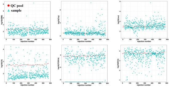 A common strategy for quality assessment in large cohorts is to include QC pooled samples representing replicates throughout the analysis and monitor the behavior of these QC samples over time [3,42,43]. Pooled quality control samples were added throughout approximately 600 injections to assess the analytical stability of the platform, see Figure 2 and supporting information Figure S2. The measured signal response of each metabolite plotted against the number of injections indicated that the metabolite signal response of the pooled samples presented very little time-related systematic variation. This behavior is demonstrated in Figure 2 through six metabolites: gamma-butyl butyrate (GBB), tryptophan (Trp), leucine (Leu), cholic acid (CA), taurochenoxycholic acid (TCDCA) and deoxycholic acid (DCA). The low variation becomes increasingly evident when QC pooled samples are compared to the samples representing the cohort that presented a wide range of responses, thus indicating method robustness, system stability and good analytical performance over several days for large studies.