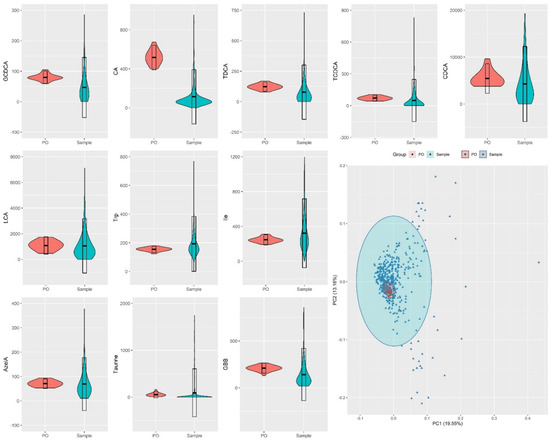 Violin plots for distribution of metabolite concentrations across human fecal samples representing a cohort with different degrees of liver disease (n = 475) and fecal pooled samples (PO), used as replicates (n = 36) for quality control. Bottom right: PCA scores plot for fecal metabolites in pooled samples and samples from the investigated cohort.