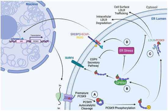 Summary of PCSK9 functions in the ER. (A) Mature PCSK9 is formed as a result of an autocatalytic cleavage event at position Q152↓, followed by the binding of the prodomain to the catalytic domain [2]. (B) The interaction between PCSK9 and ER chaperone, GRP94, mitigates PCSK9-mediated LDLR degradation [62], and increases the protein abundance of GRP94 [43,64]. (C) In addition to demonstrating co-chaperone functionality by increasing the abundance of GRP94 and protecting against ER stress, PCSK9 can act as a chaperone for pre-mature ER-resident LDLR and promote its trafficking to the cell surface [65]. (D) During conditions of ER stress, the abundance of ER-resident PCSK9 increases due to a reduction in secretion, as well as an increase in SREBP2-induced de novo synthesis [63]. Created with BioRender.com.