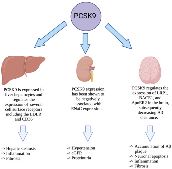 Impact of PCSK9 in non-cardiovascular diseases. PCSK9 is expressed in liver hepatocytes where it increases the stability of ER chaperones to protect against hepatic ER stress. Once secreted, PCSK9 can also contribute to hepatic steatosis, inflammation, and fibrosis. In the kidney, PCSK9 has been shown to affect hypertension, eGFR, and proteinuria. In the central nervous system, PCSK9 is also known to impact the accumulation of Aβ, leading to neuronal apoptosis, inflammation, and fibrosis.