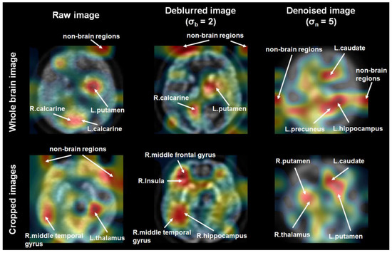 In the classification model trained using deblurred and cropped 18F-FDG PET images, the right middle frontal gyrus, insula, middle temporal gyrus, and hippocampus area were the most predictive of AD. Moreover, the right thalamus, left caudate, and bilateral putamen areas were the most predictive of AD in the classification model trained using denoised and cropped 18F-FDG PET images.