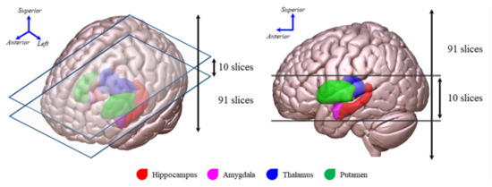 The 18F-FDG PET images with six 5-min frames were acquired beginning 30 min after injection of 5.0 ± 0.5 mCi (i.e., 185 MBq) of 18F-FDG using a Siemens scanner. Detailed information on FDG-PET image acquisition and preprocessing is available on the ADNI website (http://adni.loni.usc.edu/methods/documents/, accessed on 31 October 2021). All 18F-FDG PET images were spatially normalized to a standard space using SPM12 (https://www.fil.ion.ucl.ac.uk/spm/software/spm12/, accessed on 24 November 2021). The processed images had an image size of and a voxel size of mm3. Lastly, each 3D 18F-FDG PET image was cropped around the limbic system area (i.e., including the hippocampus, amygdala, thalamus, and putamen, Figure 3), a known metabolic dysfunction-associated area in AD patients [39], using an automated anatomical labeling atlas 2 template [40] to investigate the effect of reducing irrelevant and redundant features on classification performance.