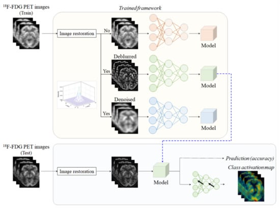Figure 4 shows the simplified schematic illustration for the prediction of cognitively normal and AD patients using the proposed framework. In brief, a 18F-FDG PET image for training implemented the image restoration using Equation (2) or Equation (3). In some cases, image restoration could not be performed to evaluate the prediction performance due to variations in the image quality. Here, the of the psf in Equation (2) was 2 and the size of was 5 5. This processing was applied to all slices with the same parameters, including the and size. Following this, each model was trained using the 18F-FDG PET dataset, which was predetermined using the image restoration components. Finally, cognitively normal or AD conditions could be predicted using a trained model with the same pre-training conditions. Moreover, a class activation map was also deduced to interpret the prediction decisions.