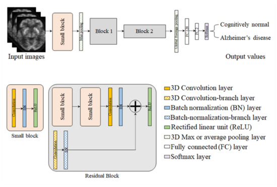 Figure 5 shows the proposed 3D deep CNN architecture, which consists of an input layer, hidden layers, and an output layer. In this network, a small block is composed of a convolution layer, batch normalization (BN) layer, and an activation layer such as a rectified linear unit (ReLU). Additionally, residual blocks have branches such as convolution and BN layers, which use the concept-of-ensemble approach [52]. The loss function was implemented by means of cross entropy, and the adaptive momentum estimation optimizer was used to update the parameters in the back-propagation. The batch size was 4, the number of epochs was 20, and the initial learning rate was 10−4. The architecture of the network is summarized in Table 5.