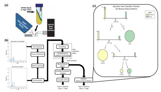Study overview for identification of pathogens from skin VOCs. (a) Summary diagram of the SPME-DART-MS procedure. SPME blades are incubated in the headspace of the agar slant with the microbes. The blades are then removed and placed in between the plasma stream of the DART plasma ionization source and the ambient pressure interface of the mass spectrometer. VOC adhered to the SPME blade are desorbed and ionized by DART. Then, the ionized VOC enter the ambient pressure interface of the mass spectrometer for measurement to produce a signature. (b) Process flow diagram for MS data preprocessing, peak detection, and ML. The mass spectra of the pathogen and blank were first min-max normalized. Linear interpolation was applied to the pathogen data to match the m/z sampling frequency of the blank to facilitate the blank subtraction step. The pathogen mass spectra were then smoothed by a mean filter, after which adaptive thresholding was applied to windows of 50 m/z intervals to obtain peak locations. These are encoded into a binary feature matrix that indicates whether a peak is present in a unit m/z interval or not. A PCA transform on this matrix was used as the input to our ML classification algorithms. (c) Interpretation of the decision tree trained on the binary feature matrix in terms of feature importance. This figure shows the distribution of bacteria and fungi samples with respect to the peak locations of most discriminatory importance (100 m/z, 377 m/z, 147 m/z).