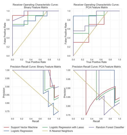 Receiver operating characteristic curves (ROC) depict the tradeoff between true positives vs. false positives for each algorithm (traces rising closer to the top left are better). The precision–recall curves (PRC) show the tradeoff between true positive vs precision in positive predictions for each algorithm (traces closer to the top right are better). This figure displays the ROC and PRC curves for classifiers trained on the binary feature matrix as well as the feature matrix after PCA, respectively.