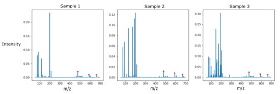 While many reports have used data analytics, dimensionality reduction, and clustering techniques to study mass spectra and identify useful markers, very few have focused on the use of supervised ML algorithms for VOC profiling. One reason for this lack of success is the lack of sufficient data to effectively train these supervised learning algorithms. In this study, we used the synthetic minority oversampling technique (SMOTE) [37] to artificially up-sample data by populating each class in the training set with convex combinations of existing data points, ensuring that the new data points retain similar characteristics. Our artificial upsampling and learning pipeline that makes it possible to train machine learning algorithms on a few samples of SPME-DART-MS data, with high precision. Most previous work [30,31,32,33] rely on an intermediate step of peak detection and identification of VOCs using the NIST05 mass spectral library. In our work, an end-to-end pipeline is developed using python, which takes the raw MS data as input and automatically performs background subtraction, peak detection, feature identification, and classification.