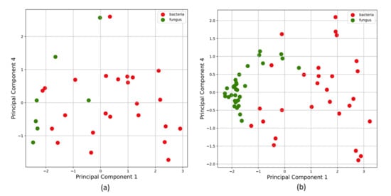Since the dataset was limited to 39 samples and heavily imbalanced towards the bacterial class, an artificial up-sampling technique called synthetic minority oversampling technique (SMOTE) [37] was utilized to generate a new up-sampled training set for the class with the lowest number of objects. This ensures ML models are more robust and have better predictive abilities. The new data points were created by SMOTE through random convex combinations of existing data points in feature space. This approach is useful while training ML algorithms in low-data or imbalanced class scenarios. The open-source imbalanced-learn library’s implementation of SMOTE [39] was used to up-sample this dataset. Figure 5 shows Principal Component Analysis (PCA) on (a) original VOC data, and (b) the dataset after SMOTE up-sampling.