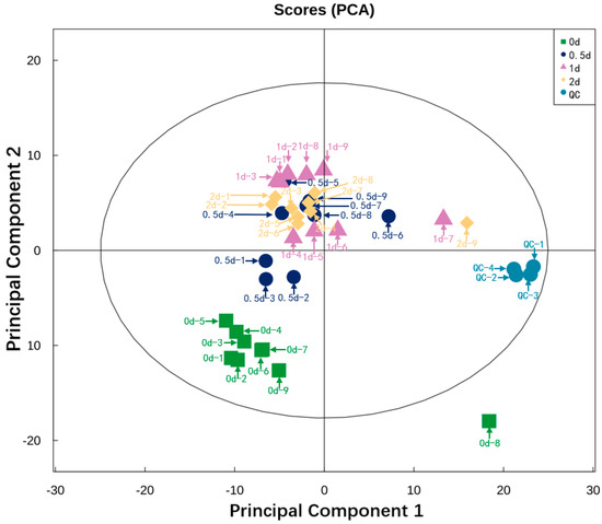 Figure 1 shows the result of PCA performed on all the experimental samples. Almost all QC samples were clustered closely, indicating high repeatability of the experiment [27]. Since the dispersion degree of several samples, namely 0 d-8, 0.5 d-6, 1 d-7, 2 d-9, these four samples were deleted. A total of 32 samples (8 samples from day 0, 0.5, 1, and 2, respectively) were conducted for subsequent identification. The degree of dispersion between these sample groups reflects the metabolic differences between the sample groups. It can be observed from the plot that the degree of dispersion between the sample groups was relatively high and the samples were adjacent within the group, which indicates relatively large metabolic differences between the sample groups. Figure 2 shows orthogonal partial least squares discriminant analysis (OPLS-DA) analysis. OPLS-DA can filter out noise irrelevant to classification information and improve the analytical ability and validity of the model. In the OPLS-DA model, the values of R2 and Q2 were used to assess the goodness of fit and predictive capacity. The closer to 1 they are, the more stable and reliable the model is. R2Y represents the rate of model interpretation, and Q2Y represents the model predictive ability. We also performed a permutation test to evaluate the goodness of fit of the OPLS-DA model. The model is deemed valid when all Q2 and R2 values to the left are lower than the original points to the right.