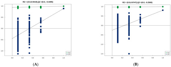 OPLS-DA model. Two hundred rounds of permutation testing were done per component. p < 0.05 was used for statistical analysis. (A) Positive ion mode; (B) Negative ion mode.