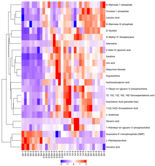 In this research, at days 0.5, 1, and 2 during postmortem aging, 15, 27, and 25 differential metabolites were obtained in the positive ion mode compared with 0 d, while 27, 36, and 34 differential metabolites were obtained in the negative ion mode. The intersection of differential metabolites between groups day 0.5/0, day 1/0, and day 2/0 was taken in positive and negative ion modes, respectively. By comparing the differential metabolites at 0.5 and 0 d, 1 and 0 d, and 2 and 0 d, 10 and 15 intersecting metabolites were obtained in positive and negative ion modes, respectively (Table 3). Thus, a total of 25 differential metabolites were obtained. These metabolites maintained large fold changes throughout the early stage of postmortem aging (day 0–2). The subsequent analysis was centered on these 25 differential metabolites.