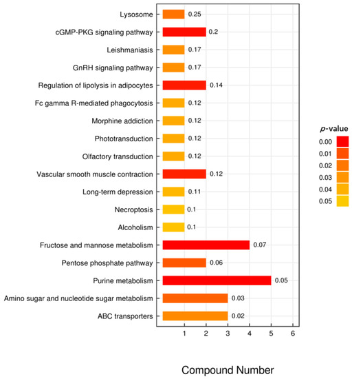 KEGG analysis of intermetabolites. In the bar chart, the vertical axis represents each KEGG metabolic pathway, while the horizontal axis represents the number of differential metabolites contained in each KEGG metabolic pathway and the numbers in front of horizontal bars represent the ratio of differential metabolites to total metabolites. The color represents the p-value of the enrichment analysis. The darker the color, the smaller the p-value, and the more statistically significant.