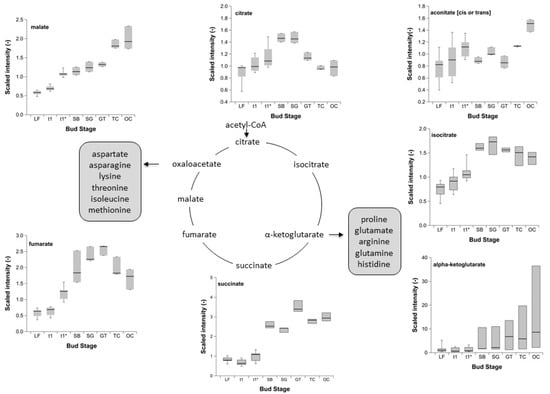 The first step of the TCA cycle, which takes place in the mitochondria, known as the ‘powerhouse of the cell’, a membrane-bound organelle found in the cytoplasm, is binding acetyl-CoA to oxaloacetate (Figure 3). After subsequent hydrolysis citrate is formed. The intensity of citrate is markedly lower at LF, t1 and t1*, compared to a maximum intensity at SB and SG, and later comparable to the stages GT, TC and OC. The isomerization of citrate yields then cis-aconitate and isocitrate (Figure 3). The importance of this step lies in the conversion of a difficult-to-oxidize tertiary alcohol (citrate) into an easy-to-oxidize secondary alcohol (isocitrate). The intensity of cis-aconitate was almost identical over the observation period, with one exception at OC, with a higher intensity. The intensity of the intermediate isocitrate can be assigned to two groups, among the endo- and ecodormancy phase, and to the bud development-related stages SB to OC. In a further step, isocitrate is oxidized and decarboxylated. In addition to the first reduction equivalent NADH, α-ketoglutarate is formed.