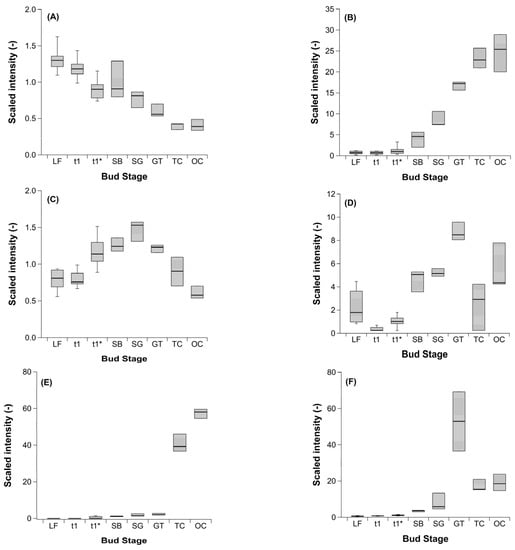 A steady decrease, a steady increase, and a steady rise and decline (Figure 4A–C) are here shown exemplarily by catechin, a polyphenol related to the flavonoids with antioxidative potential, 1-linolenolylglycerol (18:3), 1-linolenolyldigalactosylglycerol (18:3), respectively. Examples of trends which ‘vary with growth stage’, ‘undetectable low level, high level’, and ‘peak at one stage’ (Figure 4D–F) include gamma-glutamylvaline, cytidine-2′ or 3′-monophosphate (2′ or 3′-CMP), a nucleotide that is used as a monomer in RNA, and 2,3 dihydroxyisovalerate, which functions as an intermediate of the valine biosynthesis pathway, respectively. These types of data trend are not suitable to display transitions of the phenological phases endo- and ecodormancy, indicated by the three important stages, LF, t1 and t1*.