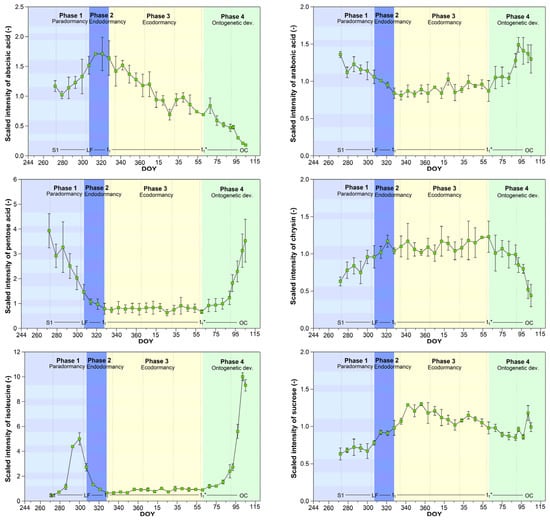 Pattern of mean intensity of abscisic acid, arabonic acid, pentose acid, chrysin, isoleucine and sucrose in the season 2015/16. Phase 1: end of paradormancy (first sampling S1-‘total leaf fall’ LF), phase 2: endodormancy (LF-endodormancy release t1), phase 3: ecodormancy (t1-beginning of ontogenetic development t1*), phase 4: first stage of ontogenetic development (t1*-‘open cluster’ OC). Error bars show the standard deviation (n = 3), DOY, day of year.