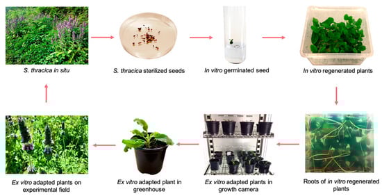 The regenerated in vitro plants with 1 cm long shoots and a well-developed root system were transferred into pots with a sterile soil mixture. The first stage of acclimation was performed in a phytotron chamber under controlled environmental conditions and a gradual decrease in relative humidity. The survival rate of S. thracica acclimated plants appeared to be relatively high—83%. In the next step, the ex vitro adapted plants were transferred to a greenhouse and adapted for a period of one month followed by transfer to normal garden soil in the experimental field (Figure 1). The percentage of surviving plants remained unchanged.