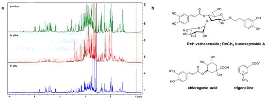 Metabolic profiling of S. thracica extracts: 1H NMR spectra of in situ, in vitro cultivated, and ex vitro adapted plants (a). Chemical structure of the main secondary metabolites identified in the extracts (b).