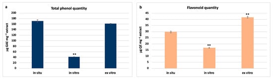 Total phenolic (a) and flavonoid (b) quantities in in situ, in vitro cultivated and ex vitro adapted S. thracica plants. Mean values ± SD are shown. Significant changes compared to in situ plants are indicated with asterisks **, (p ≤ 0.001).