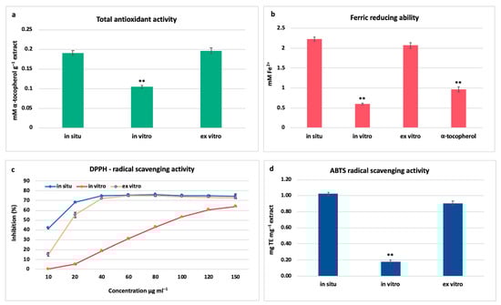 Antioxidant and radical scavenging potential of in situ, in vitro cultivated, and ex vitro adapted S. thracica plants: Total antioxidant activity (a). Ferric reducing ability of methanolic extracts compared to the standard sample of α-tocopherol (b). DPPH-radical scavenging activity (c). ABTS radical scavenging activity presented as Trolox equivalents (d). Mean values ± SD are shown. Significant changes compared to in situ plants are indicated with asterisks **, (p ≤ 0.001).