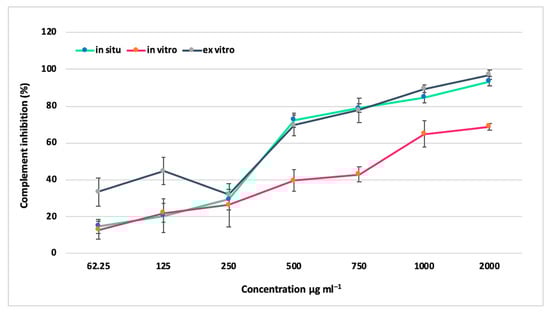 The anti-inflammatory potential was examined by monitoring the effect of methanolic extracts of S. thracica on the complement hemolytic activity via the classical pathway (CP). The complement system is an innate effector mechanism with the intrinsic ability to initiate local inflammation at the sites of accumulation of ligands for its classical recognition molecule C1q, typically immune complexes, as well as to augment significantly an ongoing inflammatory response by the generation of plethora of pro-inflammatory mediators in a cascade mode. Therefore, inhibiting the complement activation (e.g., CP) would produce a profound anti-inflammatory effect. After treatment with the S. thracica extracts a dose-dependent inhibition on the CP was observed. The extracts from in situ and ex vitro adapted plants exhibited a similar degree of inhibition reaching up to 94% and 97%, respectively, at a concentration of 2000 μg mL−1, while those from in vitro cultivated plants reached a maximum of 69% (Figure 5). The lowest concentrations at which 50% inhibition (IC50) of the hemolysis was observed were 351.7 μg mL−1 for in situ, 358.5 μg mL−1 for ex vitro adapted, and 872 μg mL−1 for in vitro cultivated plants. The extracts from in situ and ex vitro acclimated plants had not only similar trends of inhibition on the CP but also a comparable anti-inflammatory effectiveness. The extract from in vitro cultivated S. thracica was 2.5-fold less active than the rest. It is very apparent that environmental factors significantly reduce the concentration of phenolic compounds and hence the biological activity of in vitro cultivated Thracian woundwort, while in ex vitro conditions, the biosynthetic capacity is restored, and this leads to an increase in bioactivity of the plants.
