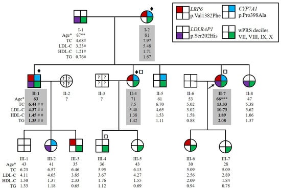 Pedigree of the family HC438 with the segregation of p.(Val1382Phe) variant in LRP6, p.(Pro398Ala) variant in CYP7A1 and p.(Ser202His) variant in LDLRAP1 and the weighted Polygenic Risk Score (wPRS). The proband II-7 is indicated by the black arrow. Squares and circles represent men and women, respectively. Affected family members are indicated by values highlighted in gray. More severely affected family members are indicated by bold values. * Age at lipid measurement in years. ** Myocardial infarction at 75 years old. *** Severe atheroma. # Under ciprofibrate. ## Under 5 mg rosuvastatin treatment. Patients for whom ♦ whole exome, □ whole genome sequencing was performed. Lipid values in mmol/L: TC for total cholesterol; LDL-C for LDL cholesterol; HDL-C for HDL cholesterol; TGs for triglycerides.