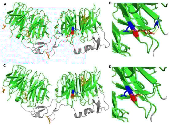 Crystal structure of wild-type and mutant LRP6-E3E4 with β-propeller domains (green) and epidermal growth factor (EGF)-like domains (gray). (A,B) LRP6-E3E4 Tyr972 residue (red) has polar contacts (yellow dotted lines) with Asp971 and Glu993 (blue). (C,D) LRP6-E3E4 mutant Cys972 residue (red) has a polar contact (yellow dotted line) only with Asp971 (blue).