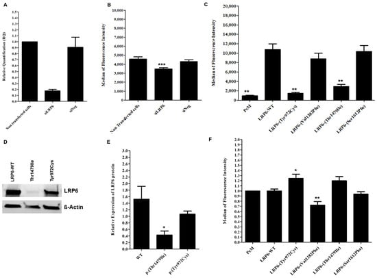 The two variants, p.(Tyr972Cys) and p.(Thr1479Ile), significantly decrease the surface expression of LRP6 compared to WT (p < 0.001) (Figure 4C), but only p.(Thr1479Ile) significantly decreases LRP6 protein expression in cells (Figure 4D,E). The two variants increase the binding and uptake of labeled LDL in HEK293T cells. However, a significant difference (p < 0.05) is observed only with the p.(Tyr972Cys) variant compared to LRP6-WT for binding and uptake measured simultaneously (Figure S4) and for uptake alone (Figure 4F).