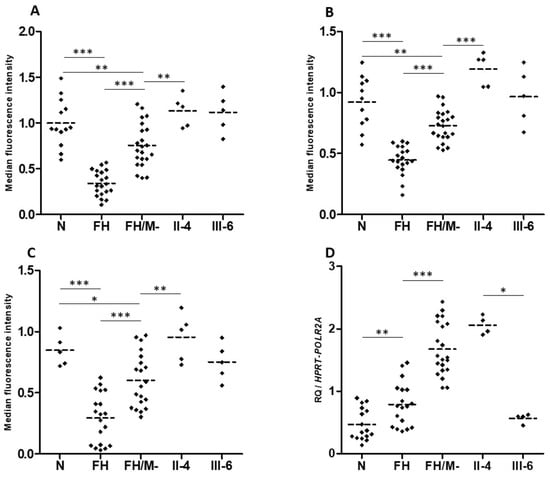 LDL receptor expression, LDL binding and uptake, and LRP6 gene expression in patients EBV-transformed B-lymphocytes. (A) LDL receptor, (B) LDL-Bodipy binding and (C) LDL-Bodipy uptake quantification in EBV-transformed B-lymphocytes from normocholesterolemic subjects (N), LDLR mutation carriers (FH), hypercholesterolemic patients without an identified mutation (FH/M-), and two LRP6-p.(Val1382Phe) carriers from the HC438 family: II-4 and III-6 (see Figure 1). The median fluorescence of living cells is presented. Data represent five independently performed assays. (D) LRP6 gene expression. Relative Quantification (RQ) of LRP6 in EBV-transformed B-lymphocytes. Reactions were run in triplicate for each cDNA. HPRT and POL2RA were used as reference genes. The relative quantification was performed using the ∆CT method. (A–D). Bonferroni’s Multiple Comparison Test in one-way ANOVA: * p < 0.05, ** p < 0.01, *** p < 0.001.