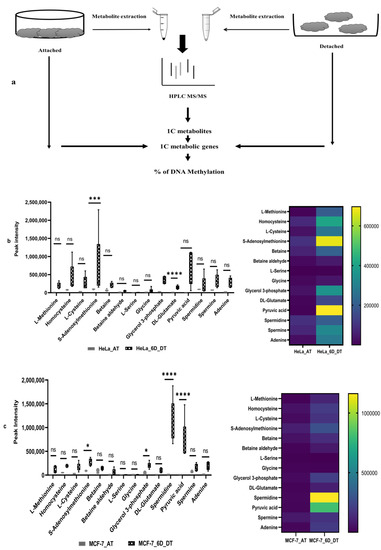 In contrast, the peak intensity results for the ECM-detached MCF-7 cell lines showed that they also accumulated higher levels of core one-carbon metabolites, such as SAM, methionine, cysteine, homocysteine, spermidine, pyruvic acid, adenine, etc. Compared with the ECM-detached HeLa cell line, the ECM-detached MCF-7 cell line had accumulated a higher level of core one-carbon metabolites to a lesser extent (Figure 1b,c). However, spermidine was highly detected in ECM-detached MCF-7 cell lines.