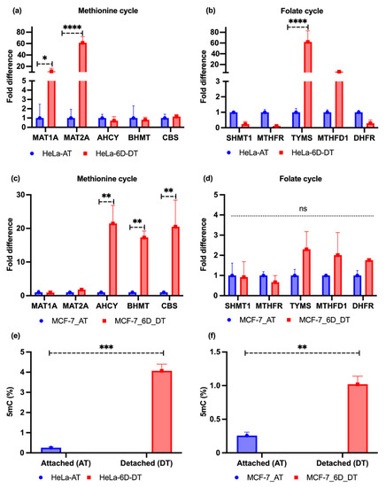 One-carbon metabolic genes and 5mC levels (%) in ECM-attached and -detached conditions. (a) The mRNA expression levels of one-carbon metabolic genes in the attached (AT) methionine cycles and 6 days detached (6D_DT) conditions in the HeLa cell lines. (b) The mRNA expression levels of one-carbon metabolic genes in folate cycles in attached (AT) and 6 days detached (6D_DT) conditions in the HeLa cell lines. (c) The mRNA expression levels of one-carbon metabolic genes in methionine cycles in attached (AT) and 6 days detached (6D_DT) conditions in the MCF-7 cell lines. (d) The mRNA expression levels of one-carbon metabolic genes in folate cycles in attached (AT) and 6 days detached (6D_DT) conditions in the MCF-7 cell lines. SHMT1, serine hydroxymethyltransferase 1; MTHFR, methylenetetrahydrofolate reductase. (e,f). HeLa and MCF-7 cell lines showed increased 5mC levels in the 6 days (6D_DT) ECM-detached condition compared to the attached (AT) condition. The data are presented as mean ± SEM; * p < 0.05, ** p < 0.01, *** p< 0.001, and **** p < 0.0001.