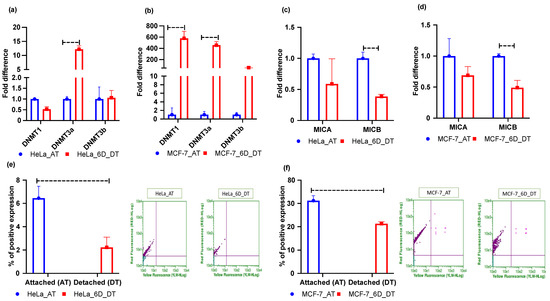 As our results showed increased levels of 5mC, global DNA methylation may also increase. Therefore, we checked the mRNA expression levels of DNMT genes. The results for HeLa and MCF-7 cell lines showed that ECM detachment induced mRNA expression of DNMTs in both cell lines (Figure 3a,b). However, MCF-7 cell lines had more DNMT mRNA induction than HeLa cell line (Figure 3b). Moreover, the innate immune system response by NK cells to counter cancer cell tumors necessitates interaction between NKG2D receptors and MICA/B ligands [25,35,36]. Hence, we performed qRT-PCR to assess MICA/B ligand mRNA expression in the 6 days ECM-detached MCF-7 and HeLa tumor cell lines. Our experimental results showed that MICA/B mRNA expression in MCF-7 and HeLa cell lines was repressed in ECM-detached conditions (Figure 3c,d). However, we also explored surface protein (MICA/B) expression through flow cytometry experiments and this showed that ECM detachment downregulated surface protein expression in both cell lines (Figure 3e,f).