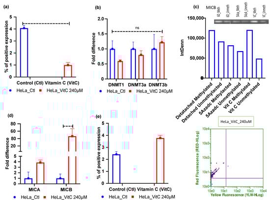 Vitamin C treatment mediated reductions in global DNA methylation, DNA methyltransferase (DNMT1/3a), and induction of MICA/B expression in ECM-detached HeLa cell lines. (a) Vitamin C treatment reduced 5mC levels. (b) Vitamin C treatment repressed DNMT1/3a mRNA expression. (c) HeLa cell line showing that 5-aza-dc and vitamin C did not reduce the methylation signal in gel electrophoresis compared to the untreated 6 Days ECM-detached condition. (d) Vitamin C treatment increased the fold changes in mRNA expression of MICA/B in the 6 days ECM-detached condition. (e) Vitamin C treatment increased surface MICA/B expression. 6D_Meth, 6 days detached, methylated; 6D_Unmrth, 6 days detached, unmethylated; 5Azadc_Meth, 5-aza-dc methyl-treated; 5Azadc_Unmeth, 5-aza-dc unmethylated; VC_meth, vitamin C methyl-treated; VC_Unmeth, vitamin C unmethylated. The data are presented as mean ± SEM; ns, not significant.