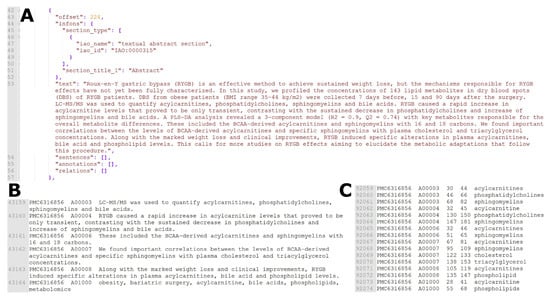 Data processing and corpus generation. (A) The Auto-CORPus output (BioC JSON format) for the abstract of PMC6116856. (B) Extracted sentences containing annotations in the abstract (part of the metabolomics corpus, training set). (C) Rule-based annotations for the abstract sentences (part of the metabolomics corpus, training set).