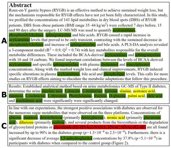 To the best of our knowledge, our metabolomics corpus, which consists of the abstract, method, result and discussion sections of 183 manually annotated (test set) and 1034 semi-automatically annotated (training set) PMC articles, is the first available corpus that is designed for human metabolomics research. While some databases include some references to articles where metabolites are mentioned, the databases do not contain enough information (e.g., annotated texts) for NLP model development. An advantage of our metabolomics corpus, compared to common chemical NER corpora [,], is that it contains not only abstracts but also sentences from the method, result and discussion sections which is relevant for context-dependent NER. While abstracts indeed provide a rich set of context, the structure of sentences is often different from the main text and therefore training and employing contextual NLP models only on abstracts could potentially result in overlooking valuable information while mining the full text of articles. Methods sections are included since these can include information on targeted metabolites with different assays.