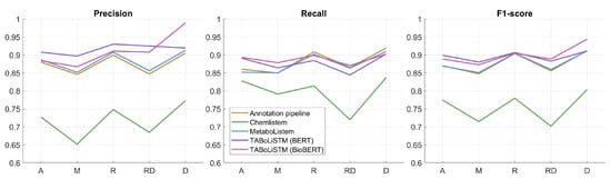 The metabolomics corpus was split into a training set (1034 articles, 49,007 sentences, 105,335 annotations) and a test set (183 articles). The test set was manually annotated and consists of 8950 sentences with 19,138 annotations. We first evaluated the application of the rule-based annotation pipeline on the independent test set articles. Our pipeline yields an F1-score of 0.8893, with precision and recall of 0.8850 and 0.8937 respectively (see Table 3). Next, we evaluated the performance of ChemListem [], trained on the BioCreative V5 dataset, on the metabolomics corpus test set where it achieves an F1-score of 0.7669. Our first DL model uses the same architecture as ChemListem but was trained on the metabolomics training corpus, therefore this model was named MetaboListem, and it achieved an F1-score of 0.8900 (precision of 0.8923 and recall of 0.8877). Our second DL model uses a different embedding layer (BERT or BioBERT) to MetaboListem, but was trained on the same training dataset. The TABoLiSTM (Transformed-Affixed Bidirectional LSTM) model with BERT embeddings achieved an F1-score of 0.9004, with precision and recall rates of 0.9187 and 0.8829 respectively; the same model with BioBERT embeddings results in a 0.85% improvement of the F1-score.