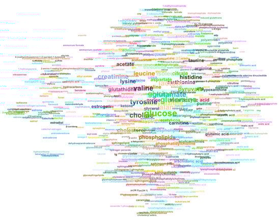 Graphical representation of metabolites mentioned in the abstract, results and discussion sections of 492 cancer-related metabolomics articles. Each node represents a metabolite and is displayed as the (lower-cased) metabolite name if it appeared in 3 or more articles. The closer metabolites are in the graph, they are more likely to co-occur in the same article. The text is sized proportionally to the number of articles that report the metabolite.