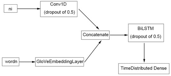 For ChemListem [], name-internal features for each token were computed in the pre-processing stage using the pre-classifier and treated as one of the two inputs to the model (Figure 6). The features go through a convolutional layer with width of 3 and are concatenated with the numeric representation of words (i.e., a unique number assigned to each word) in the GloVe [] vector space. Each token now has 256 + 300 = 556 dimensions, where 256 is the output neuron number of the convolutional layer, and 300 the GloVe vector representation. The concatenated tensor is then fed into the BiLSTM layer, before outputting a 5-dimensional result (number of tags used in BIOES tagging) via a TimeDistributed Dense neuron.